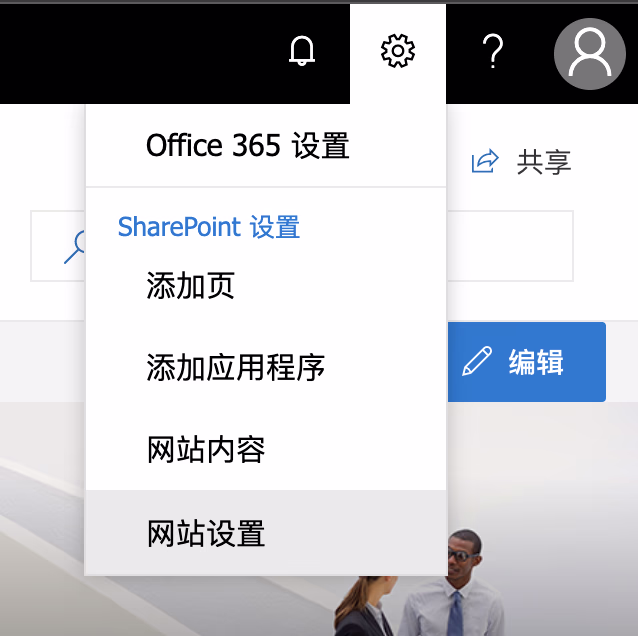 1. 进入要共享的站点,然后点击设置齿轮 - 网站设置